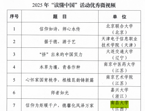 近日,教育部关心下一代工作委员会公布了2025年“读懂中国”活动入选作品名单。我校报送的微视频作品《信仰为炬暖千户,德馨化凤泽万家》荣获“优秀微视频奖”,学校关工委同时获得教育部关工委通报表扬。